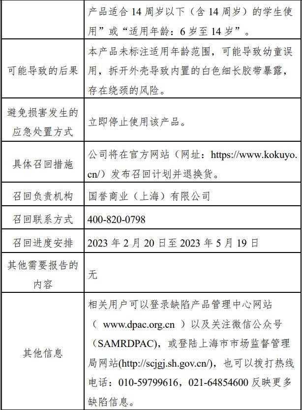 國譽(yù)商業(yè)(上海)有限公司將在官方網(wǎng)站(網(wǎng)址:https://www.kokuyo.cn/)發(fā)布召回計(jì)劃并退換貨。(中新財(cái)經(jīng))