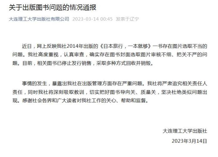 中新網(wǎng)3月14日電 據(jù)大連理工大學(xué)出版社有限公司官方微信消息,大連理工大學(xué)出版社14日發(fā)布情況通報稱,近日,網(wǎng)上反映大連理工大學(xué)出版社2014年出版的《日本旅行,一本就夠》一書存在圖片選取不當(dāng)?shù)膯栴}。該社高度重視,認(rèn)真審查,確實存在圖書封面選取圖片審核不細(xì)、把關(guān)不嚴(yán)的問題。目前,相關(guān)圖書已停止發(fā)行銷售,采取多種方式回收并銷毀。
