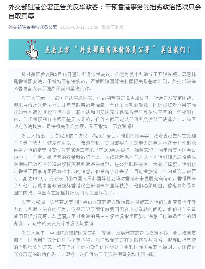 中新網(wǎng)3月16日電 據(jù)外交部駐港公署微信公眾號消息,針對美國參議院3月15日通過所謂涉港決議,公然為反中亂港分子開脫說項,惡意抹黑香港國安法,干擾特區(qū)依法施政,嚴重踐踏國際法和國際關系基本準則,外交部駐港公署發(fā)言人表示強烈不滿和堅決反對。