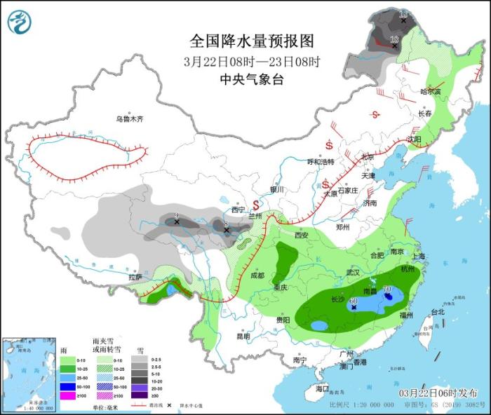3月22日08時(shí)至23日08時(shí),內(nèi)蒙古東北部、黑龍江西北部、西藏東部、西北地區(qū)中部等地的部分地區(qū)有小到中雪,其中,內(nèi)蒙古東北部、黑龍江西北部、青海南部等地的部分地區(qū)有大到暴雪(10~18毫米)。西藏東南部、江南中南部、貴州東南部、廣西東北部等地的部分地區(qū)有中到大雨,局部有暴雨(50~70毫米)。內(nèi)蒙古中東部、東北地區(qū)西部、華北等地的部分地區(qū)有4~6級(jí)風(fēng),其中,內(nèi)蒙古東北部等地部分地區(qū)有6~7級(jí)風(fēng)。