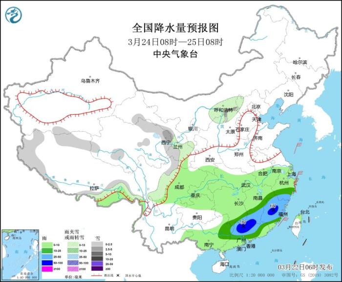3月24日08時(shí)至25日08時(shí),西藏西部、青海東部、甘肅南部、山西北部、川西高原北部等地的部分地區(qū)有小到中雪或雨夾雪。江南南部、華南中北部等地的部分地區(qū)有中到大雨,其中,江西南部、福建中部、廣東北部等地部分地區(qū)有暴雨(50~90毫米)。黃海大部海域?qū)⒂?~7級(jí)風(fēng)、陣風(fēng)8級(jí),部分海域陣風(fēng)可達(dá)9級(jí)。
