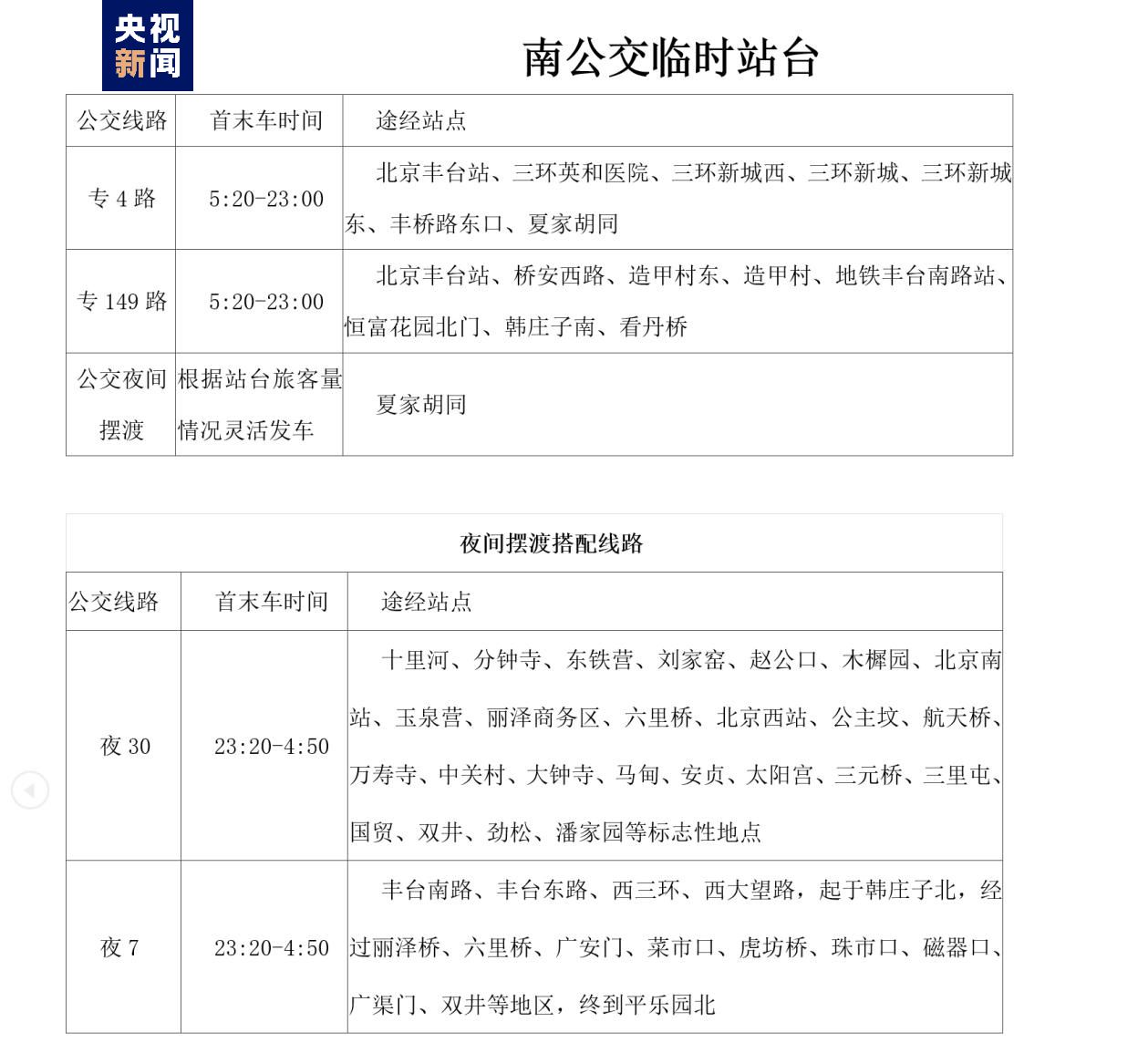 0時至5時,北京豐臺站,在出租車調度站及南廣場臨時公交站臺區(qū)域設有免費擺渡車幫助旅客離站,共計兩個方向,具體如下: