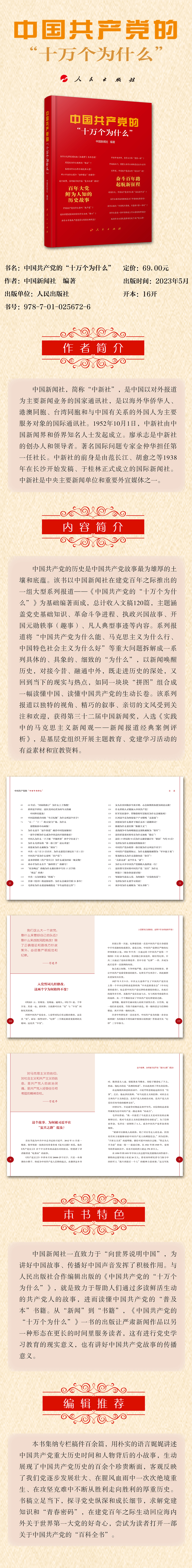 中國(guó)共產(chǎn)黨的歷史是中國(guó)共產(chǎn)黨故事最為雄厚的土壤和底蘊(yùn)。該書以中國(guó)新聞社在建黨百年之際推出的一組大型系列報(bào)道——《中國(guó)共產(chǎn)黨的“十萬(wàn)個(gè)為什么”》為基礎(chǔ)編著而成,總計(jì)收入文稿120篇,主題涵蓋黨史基礎(chǔ)知識(shí)、革命斗爭(zhēng)進(jìn)程、執(zhí)政興國(guó)故事、開國(guó)元?jiǎng)纵W事(趣事)、凡人典型事跡等內(nèi)容。系列報(bào)道將“中國(guó)共產(chǎn)黨為什么能、馬克思主義為什么行、中國(guó)特色社會(huì)主義為什么好”等重大問題拆解成一系列具體的、具象的、細(xì)致的“為什么”,以新聞喚醒歷史,對(duì)接今昔、融通中外,既走進(jìn)歷史的深處,又回到當(dāng)下的現(xiàn)實(shí)與熱點(diǎn),如同一塊塊“拼圖”組合成一幅讀懂中國(guó)、讀懂中國(guó)共產(chǎn)黨的生動(dòng)長(zhǎng)卷。該系列報(bào)道以獨(dú)特的視角、精巧的敘事、親切的文風(fēng)受到關(guān)注和歡迎,獲得第三十二屆中國(guó)新聞獎(jiǎng),入選《實(shí)踐中的馬克思主義新聞?dòng)^——新聞報(bào)道經(jīng)典案例評(píng)析》,是基層黨組織開展主題教育、黨建學(xué)習(xí)活動(dòng)的有益素材和宣教資料。