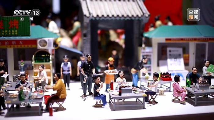 要說本次文博會最吸引人的展位,淄博燒烤算一個??墒牵瑹驹趺催M了文博會?原來,這是一個2.8米長的軟陶泥塑微縮景觀,生動還原了淄博燒烤的現實場景。此外,展臺上的琉璃燒烤大餐也吸引了不少人拍照打卡。當然,現場還是有可以吃的美食——大名鼎鼎的山東煎餅。