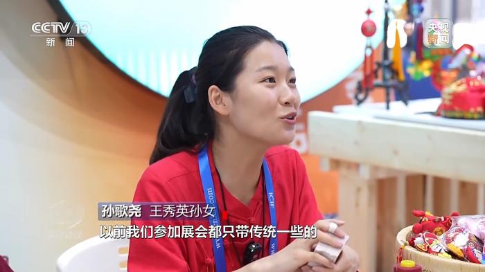 王秀英孫女孫歌堯:第一天人特別多,也有好多參展商們來我這邊參觀想合作,比如給我們一些logo,或者幫他定制一些香包。我們帶動馬莊村300多位村民一起做,1天產量能達到3000個,去年馬莊香包年產值800萬元。