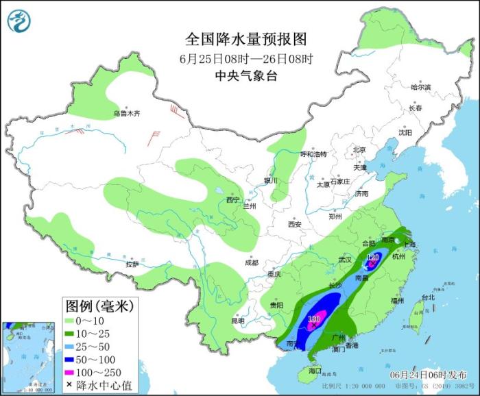 24日至25日,江南中東部和南部、華南等地仍有大范圍強降水,部分地區(qū)有暴雨或大暴雨,局地伴有雷暴大風(fēng)等強對流天氣。其中,24日08時至25日08時,蘇皖南部、上海、浙江北部和西部、福建西北部、江西大部、湖南南部、廣西大部、廣東中西部、云南南部等地部分地區(qū)有大到暴雨,其中,江蘇東南部、上海東部、廣西中部和南部沿海、廣東北部等地局部地區(qū)有大暴雨(100~160毫米);上述部分地區(qū)伴有短時強降水(最大小時降雨量20~60毫米,局地可超過80毫米),局地有雷暴大風(fēng)等強對流天氣。為此,中央氣象臺6月24日06時繼續(xù)發(fā)布暴雨黃色預(yù)警。