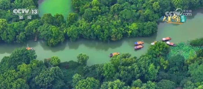 這里是杭州西溪國(guó)家濕地公園。盛夏時(shí)節(jié),杭州西溪濕地草木蔥蘢、綠樹成蔭,鷺舞燕翔、荷香魚躍,星羅棋布的魚塘呈現(xiàn)出“萬(wàn)塘攬勝”的美景。這里生態(tài)資源豐富,有維管束植物739種、鳥類203種、昆蟲911種、魚類56種。二十年來(lái),杭州西溪濕地以保護(hù)原生態(tài)為目標(biāo),統(tǒng)籌生產(chǎn)、生活、生態(tài)三大空間布局,探索了一條濕地保護(hù)與利用雙贏的道路。