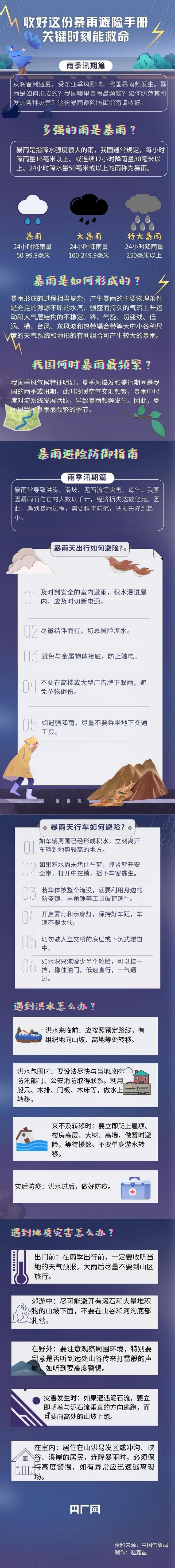 央廣網(wǎng)長春7月5日消息(記者郭東隅)正值汛期,我國多地遭遇今年以來最強(qiáng)降雨過程,出現(xiàn)暴雨、大暴雨甚至特大暴雨。那么,暴雨究竟是如何形成的?如何防范其引發(fā)的各種災(zāi)害?這份暴雨避險(xiǎn)防御指南請收好,關(guān)鍵時(shí)刻能救命。