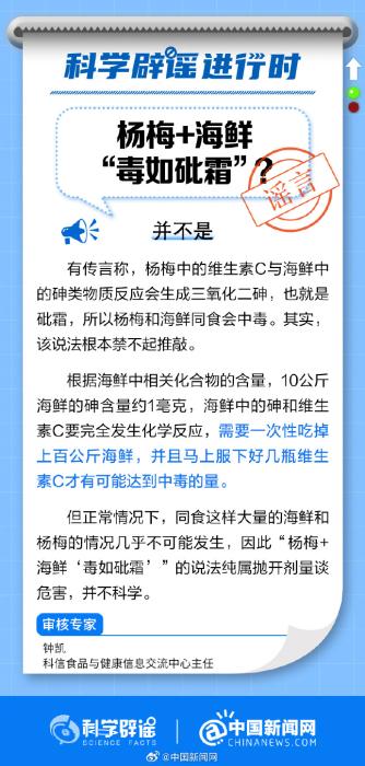 中新網(wǎng)7月14日電 有傳言稱(chēng),楊梅中的維生素C與海鮮中的砷類(lèi)物質(zhì)反應(yīng)會(huì)生成三氧化二砷,也就是砒霜。這個(gè)說(shuō)法科學(xué)嗎?戳圖片了解真相↓(來(lái)源:科學(xué)辟謠、中國(guó)新聞網(wǎng)微博)