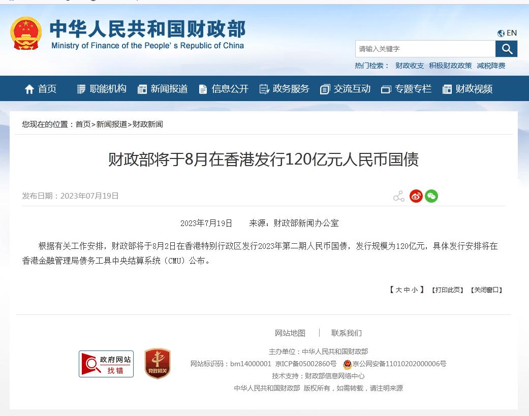 中新網(wǎng)7月19日電 據(jù)財政部網(wǎng)站19日消息,根據(jù)有關工作安排,財政部將于8月2日在香港特別行政區(qū)發(fā)行2023年第二期人民幣國債,發(fā)行規(guī)模為120億元,具體發(fā)行安排將在香港金融管理局債務工具中央結算系統(tǒng)(CMU)公布。