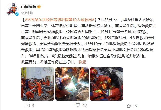 中新網(wǎng)7月23日電 據(jù)中國(guó)消防官微消息,7月23日下午,黑龍江省齊齊哈爾市第三十四中學(xué)一體育館發(fā)生坍塌,事故造成多人被困。事故發(fā)生后,消防救援力量第一時(shí)間趕赴現(xiàn)場(chǎng)救援,經(jīng)過(guò)多方共同努力,19時(shí)14分第十名被困者獲救。