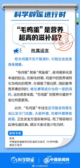 純屬謠言!“毛雞蛋”就是“死胎蛋”,是雞蛋孵化至半途的胚胎。“毛雞蛋”的營(yíng)養(yǎng)價(jià)值并不比雞蛋更高,其中還可能含有寄生蟲以及沙門氏菌、大腸桿菌、傷寒桿菌等致病菌,衛(wèi)生安全很難保證,吃了極容易引起消化道疾病。(來源:科學(xué)辟謠、中國(guó)新聞網(wǎng)微博)