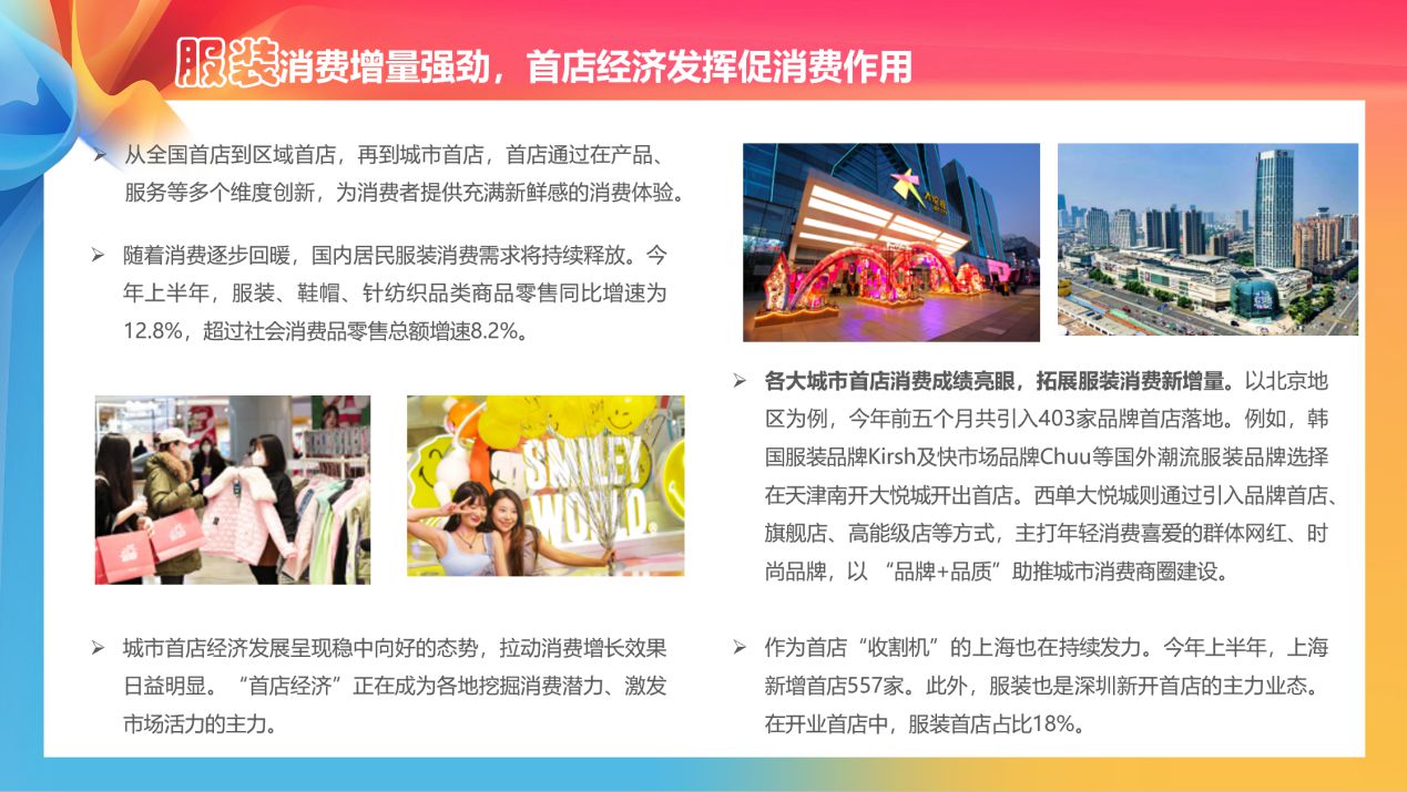 在服裝消費方面,隨著消費逐步回暖,國內(nèi)居民服裝消費需求將持續(xù)釋放。以北京地區(qū)為例,今年前五個月共引入403家品牌首店落地。例如,韓國服裝品牌Kirsh及快市場品牌Chuu等國外潮流服裝品牌選擇在天津南開大悅城開出首店。西單大悅城則通過引入品牌首店、旗艦店、高能級店等方式,主打年輕消費喜愛的群體網(wǎng)紅、時尚品牌,以“品牌+品質(zhì)”助推城市消費商圈建設(shè)。《報告》認(rèn)為,“首店經(jīng)濟(jì)”正在成為各地挖掘消費潛力、激發(fā)市場活力的主力。