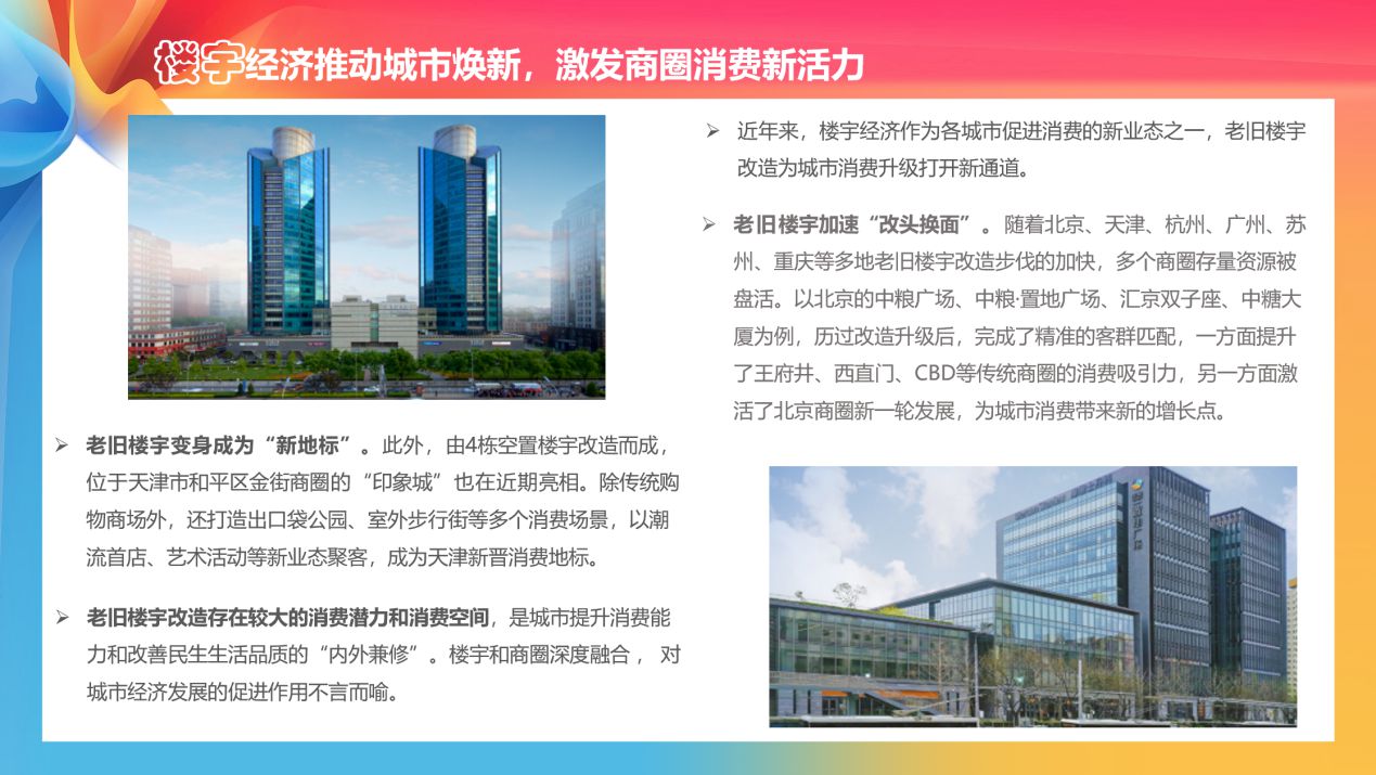 老舊樓宇改造存在較大的消費潛力和消費空間,是城市提升消費能力和改善民生生活品質(zhì)的“內(nèi)外兼修”?!秷蟾妗肥崂碇赋觯S著北京、天津、杭州、廣州、蘇州、重慶等多地老舊樓宇改造步伐的加快,多個商圈存量資源被盤活。以北京的中糧廣場、中糧·置地廣場、匯京雙子座、中糖大廈為例,通過舊改提升、輕(中)資產(chǎn)輸出等方式,打造高端商務(wù)地標(biāo),完成了精準(zhǔn)的客群匹配,一方面提升了王府井、西直門、CBD等傳統(tǒng)商圈的消費吸引力,另一方面激活了北京商圈新一輪發(fā)展,推動片區(qū)重構(gòu)和能級提升,為城市消費帶來新的增長點。