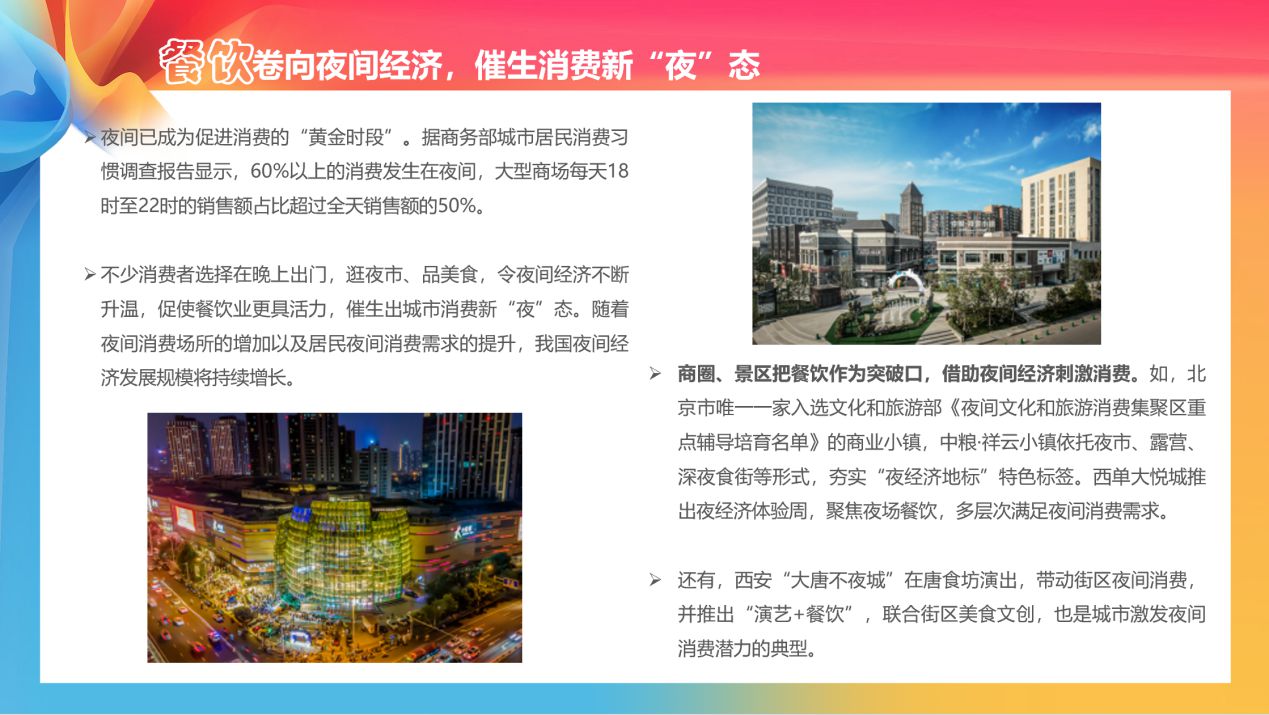 在餐飲消費方面,隨著夜間消費場所的增加以及居民夜間消費需求的提升,我國夜間經(jīng)濟(jì)發(fā)展規(guī)模將持續(xù)增長。例如,北京市唯一一家入選文化和旅游部《夜間文化和旅游消費集聚區(qū)重點輔導(dǎo)培育名單》的商業(yè)小鎮(zhèn),中糧·祥云小鎮(zhèn)依托夜市、露營、深夜食街等形式,構(gòu)建了“商圈+生活圈+夜經(jīng)濟(jì)”的消費重地,榮獲北京十大商業(yè)品牌、消費季品牌榜“十大文化消費地標(biāo)”。西安“大唐不夜城”在唐食坊演出,帶動街區(qū)夜間消費,并推出“演藝+餐飲”,聯(lián)合街區(qū)美食文創(chuàng),也是城市激發(fā)夜間消費潛力的典型?!秷蟾妗氛J(rèn)為,隨著夜間消費場所的增加以及居民夜間消費需求的提升,我國夜間經(jīng)濟(jì)發(fā)展規(guī)模將持續(xù)增長。