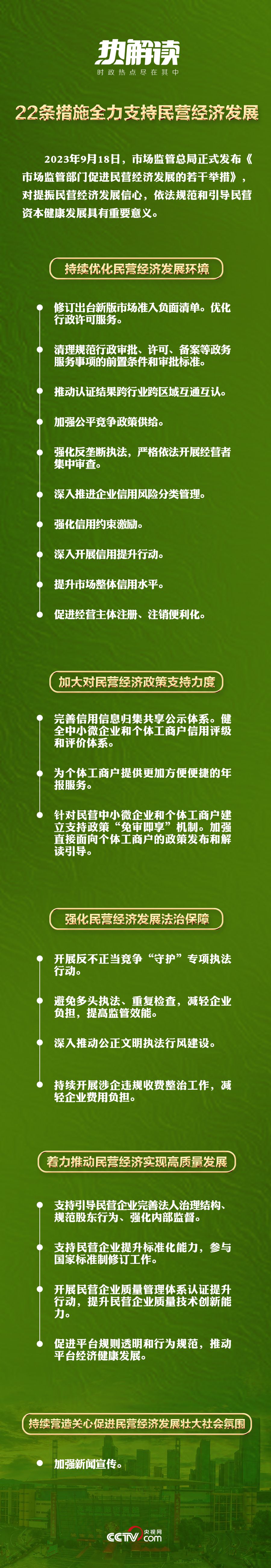 2023年7月14日,中共中央國(guó)務(wù)院出臺(tái)《關(guān)于促進(jìn)民營(yíng)經(jīng)濟(jì)發(fā)展壯大的意見》,對(duì)促進(jìn)民營(yíng)經(jīng)濟(jì)發(fā)展壯大作出新的重大部署。2023年9月18日,市場(chǎng)監(jiān)管總局發(fā)布《市場(chǎng)監(jiān)管部門促進(jìn)民營(yíng)經(jīng)濟(jì)發(fā)展的若干舉措》,通過(guò)22條措施為全力支持民營(yíng)經(jīng)濟(jì)發(fā)展設(shè)計(jì)了具體落實(shí)的“施工圖”。