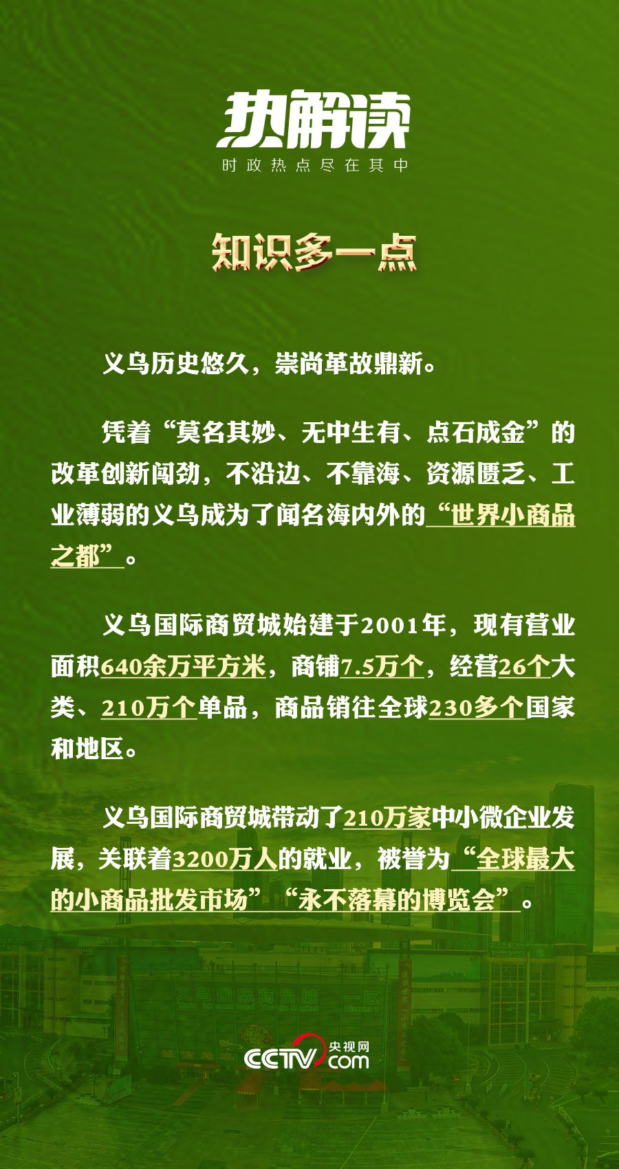 篳路藍(lán)縷,以啟山林。從“雞毛換糖”到“世界超市”,40多年來(lái),義烏不斷書寫新的傳奇。習(xí)近平總書記為義烏定位“世界小商品之都”,推動(dòng)開展義烏國(guó)際貿(mào)易綜合改革,實(shí)現(xiàn)跨越式發(fā)展。