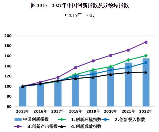 測算結(jié)果顯示,以2015年為基期,2022年中國創(chuàng)新指數(shù)為155.7,4個分領(lǐng)域指數(shù)創(chuàng)新環(huán)境指數(shù)、創(chuàng)新投入指數(shù)、創(chuàng)新產(chǎn)出指數(shù)和創(chuàng)新成效指數(shù)分別為160.4、146.7、187.5和128.2。與2015年相比,中國創(chuàng)新指數(shù)年均增長6.5%,比同期國內(nèi)生產(chǎn)總值(GDP)增速快0.8個百分點;4個分領(lǐng)域指數(shù)年均增速分別為7.0%、5.6%、9.4%和3.6%。與2021年相比,中國創(chuàng)新指數(shù)增長5.9%,4個分領(lǐng)域指數(shù)分別增長5.7%、7.0%、9.2%和0.7%。