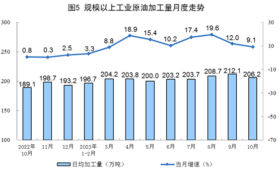 原油加工保持穩(wěn)定增長(zhǎng)。10月份,加工原油6393萬(wàn)噸,同比增長(zhǎng)9.1%,增速比9月份放緩2.9個(gè)百分點(diǎn),日均加工原油206.2萬(wàn)噸。1—10月份,加工原油61876萬(wàn)噸,同比增長(zhǎng)11.2%。