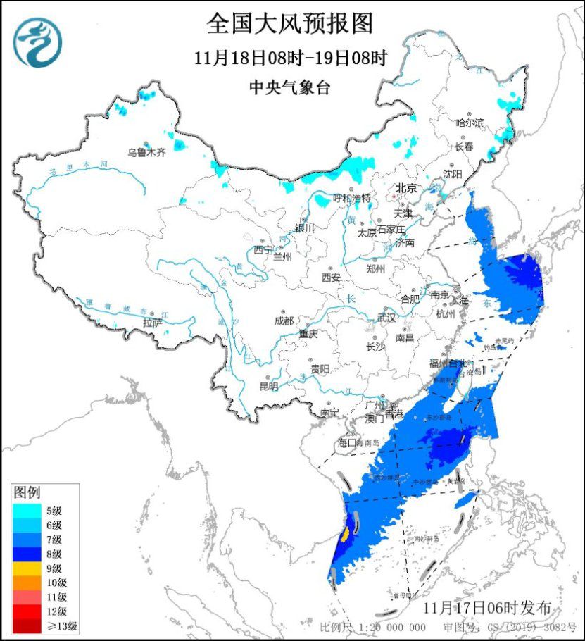 11月17日08時至18日08時,內(nèi)蒙古中東部、東北大部、河北北部、山東半島東部等地將有5~6級、陣風(fēng)7~8級的大風(fēng);渤海、渤海海峽、黃海大部海域、東海大部海域、臺灣海峽、臺灣以東洋面、巴士海峽、南海大部海域?qū)⒂?~8級、陣風(fēng)9~10級的大風(fēng)。11月18日08時至19日08時,內(nèi)蒙古中東部、黑龍江東部、吉林東部等地將有5~6級、陣風(fēng)7~8級的大風(fēng);黃海東部海域、東海東北部海域、臺灣海峽、臺灣以東洋面偏南海域、巴士海峽、南海大部海域?qū)⒂?~8級、陣風(fēng)9~10級的大風(fēng)。中央氣象臺11月17日06時繼續(xù)發(fā)布大風(fēng)藍(lán)色預(yù)警。