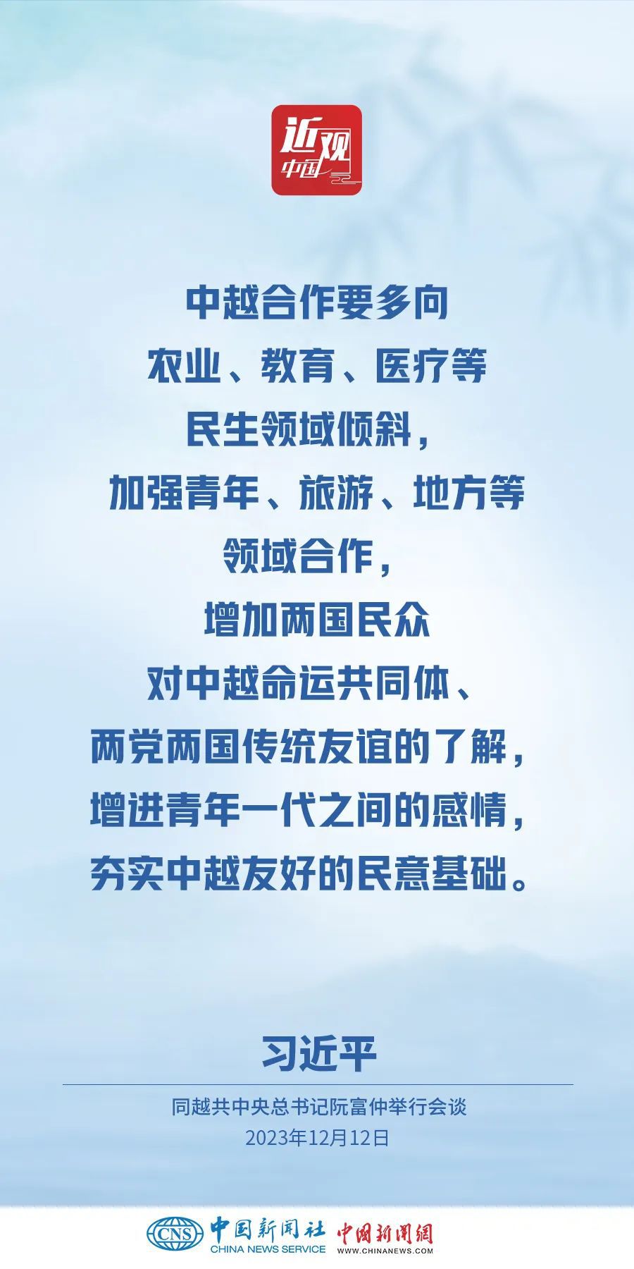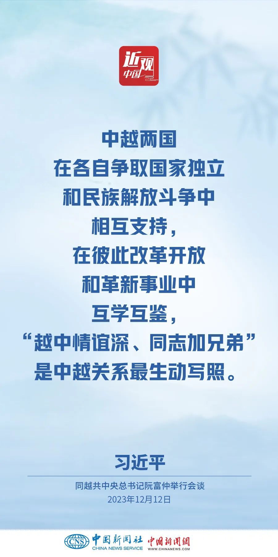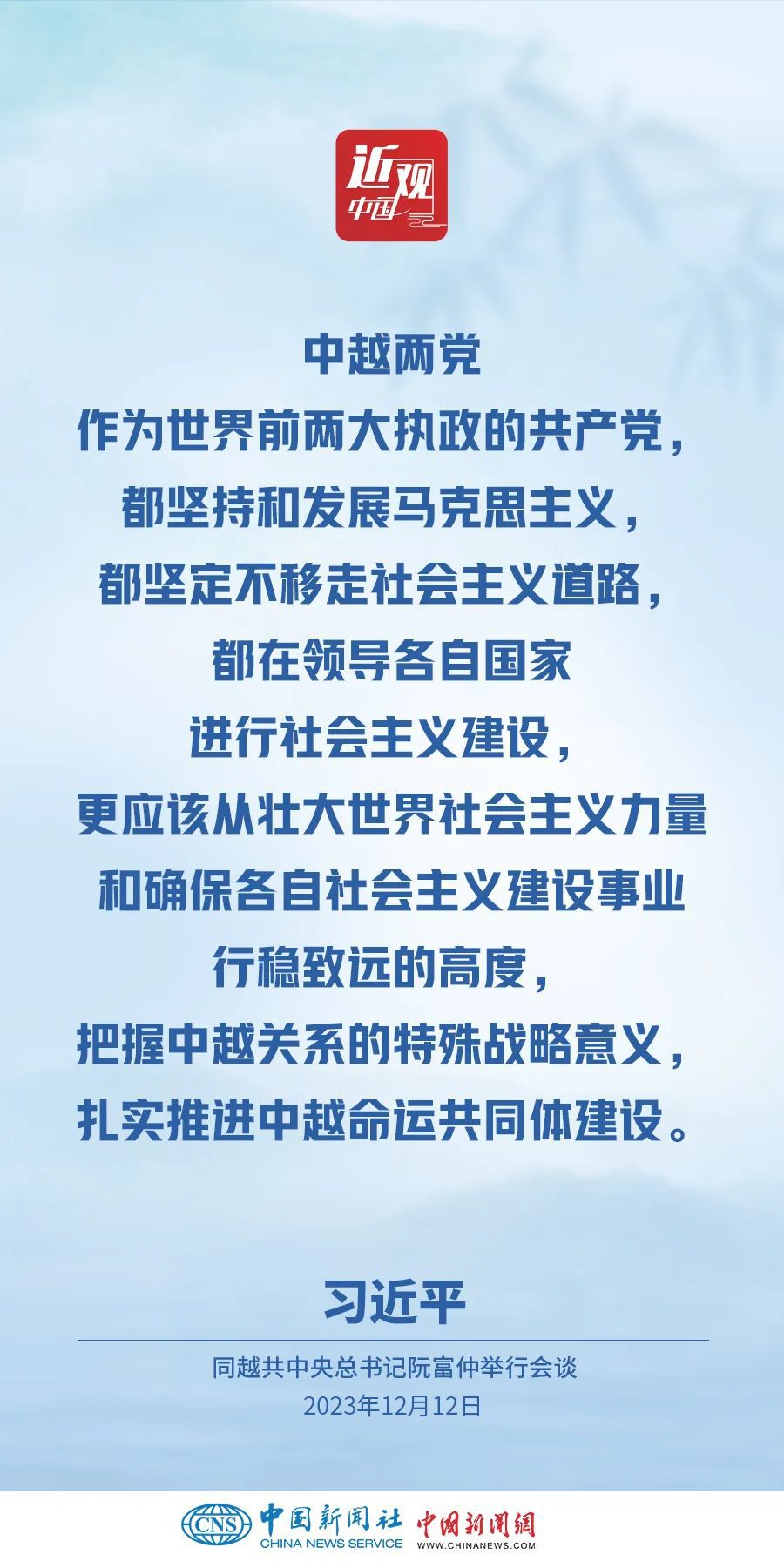 當(dāng)?shù)貢r(shí)間12月12日下午,剛剛抵達(dá)河內(nèi)的中共中央總書(shū)記、國(guó)家主席習(xí)近平在越共中央駐地同越共中央總書(shū)記阮富仲舉行會(huì)談。雙方宣布中越兩黨兩國(guó)關(guān)系新定位,在深化中越全面戰(zhàn)略合作伙伴關(guān)系基礎(chǔ)上,攜手構(gòu)建具有戰(zhàn)略意義的中越命運(yùn)共同體。習(xí)近平指出——