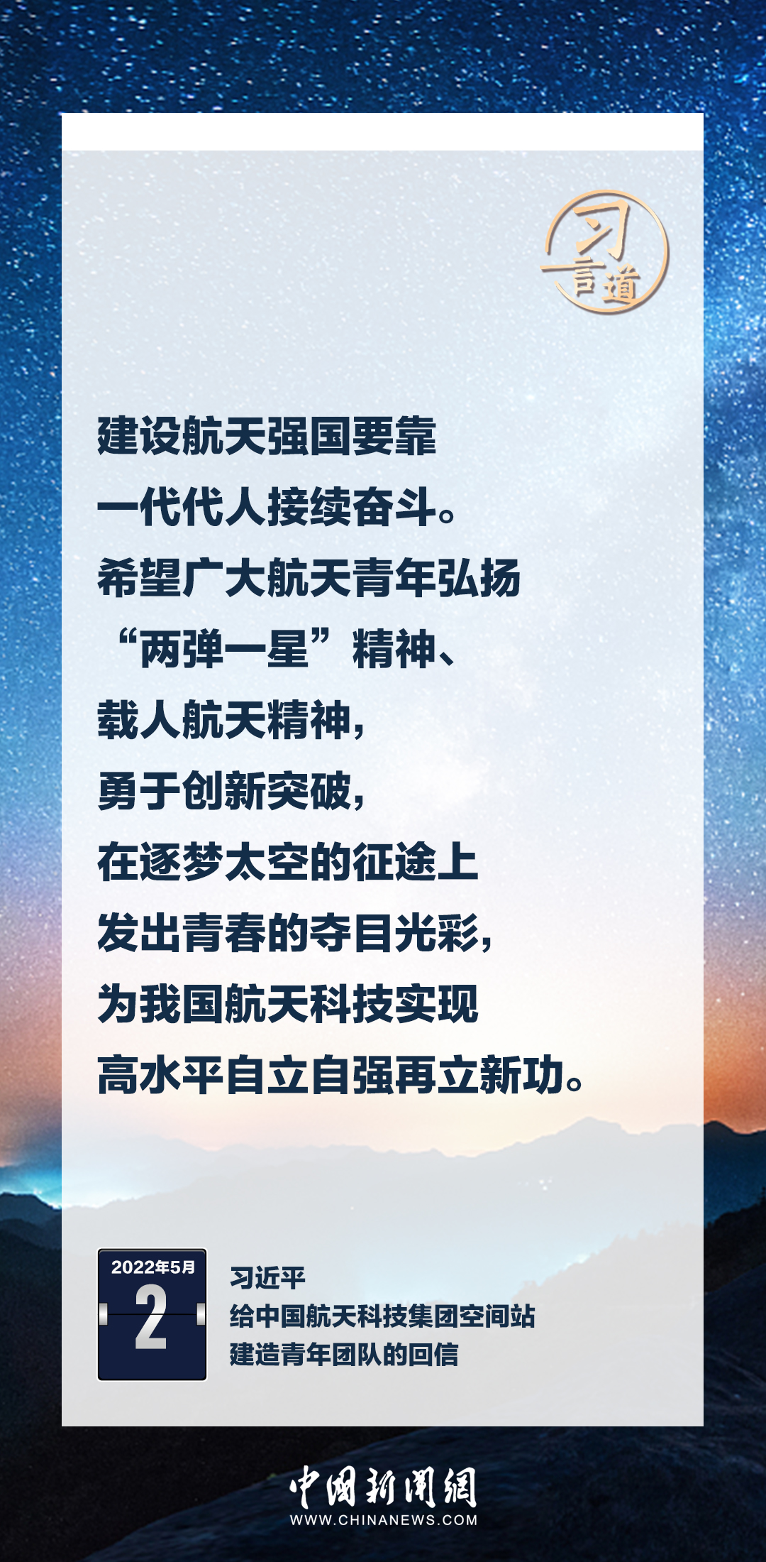 建設(shè)航天強國要靠一代代人接續(xù)奮斗。在不同場合,習近平總書記頻頻提及航天精神,激勵一代代中國人不斷奮進、筑夢太空。