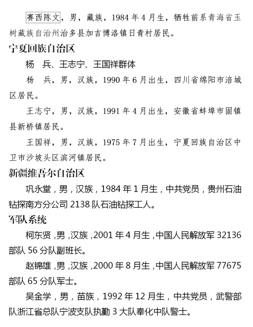 上榜勇士中有勇斗持刀犯罪嫌疑人身負(fù)重傷的張照杰、姚玉龍、王沖、王永芳;有從高橋跳水救人的周中磊、曾文文、周海;有從隨時(shí)可能爆炸的事故車輛中救出司機(jī)母子的湯益鑫;有冒著煤氣罐爆炸危險(xiǎn)制服劫持孩子歹徒的蔡國榮;有救援被困電梯內(nèi)同事而導(dǎo)致左小腿截肢的翟元敏;有休假期間水下連續(xù)救人的現(xiàn)役軍人柯東賢、吳金學(xué)、趙錦雄;更有見義勇為英勇犧牲的李偉倫、張嘉俊、張可可、李峰武、安西德、何同猛、曾維龍、胡喜明、李振華、東周才仁、賽西陳文11位同志。勇士們見義勇為事跡鼓舞人心、振奮精神、催人奮進(jìn)。他們用血汗甚至生命秉承、詮釋了中華民族傳統(tǒng)美德,用奮不顧身的實(shí)際行動(dòng)踐行了社會(huì)主義核心價(jià)值觀。