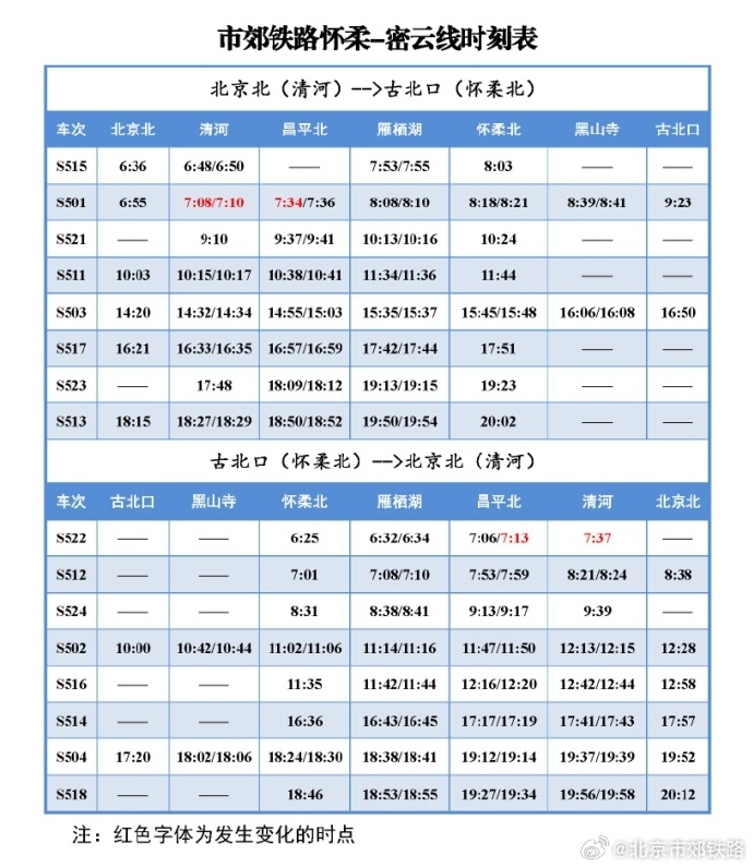 北京市郊鐵路:1月10日起 懷柔-密云線列車(chē)開(kāi)行時(shí)點(diǎn)調(diào)整