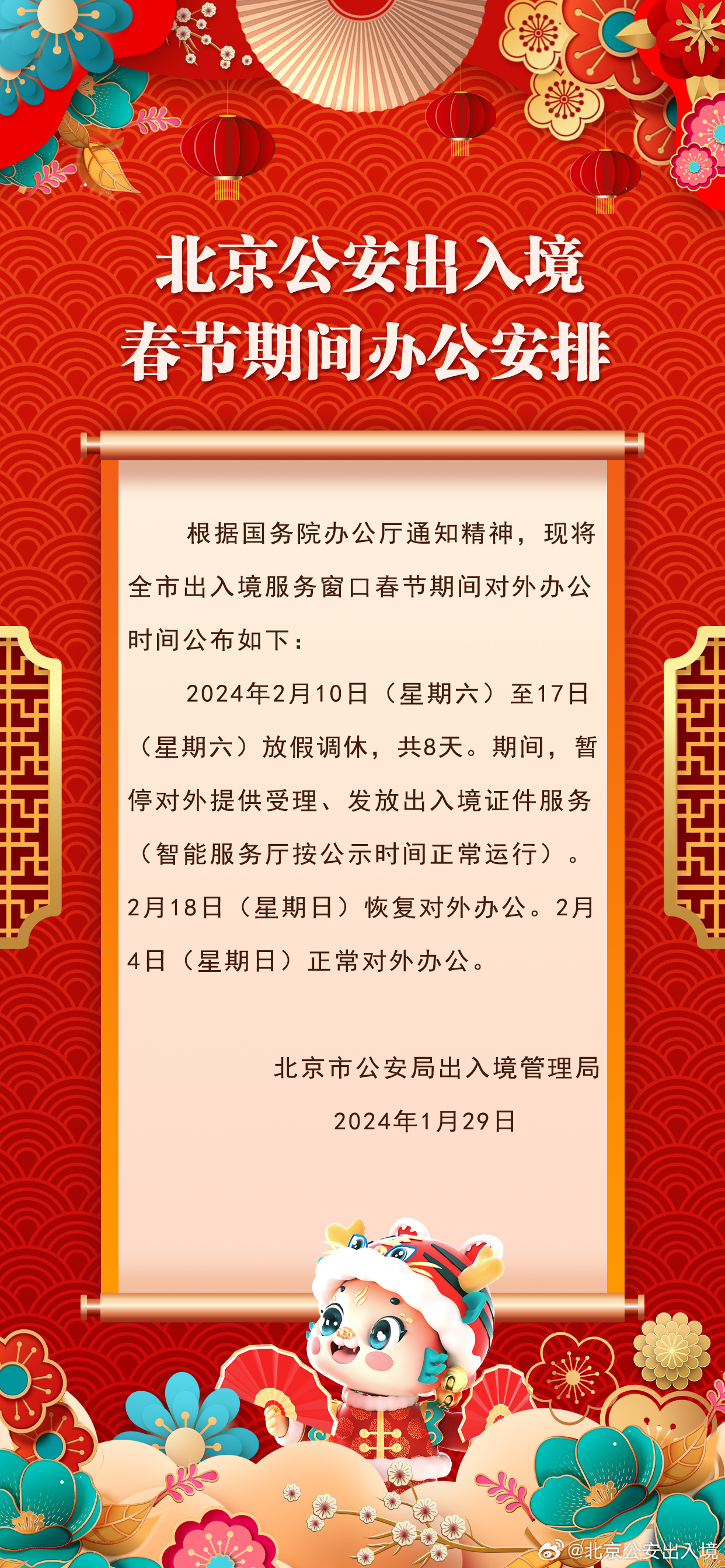 北京市公安局出入境管理局:大年初一到初八暫停對外辦公