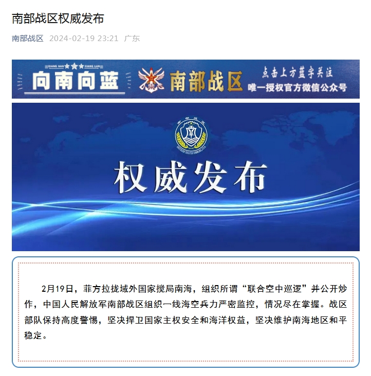 中新網2月19日電 據南部戰(zhàn)區(qū)微信公眾號消息,2月19日,菲方拉攏域外國家攪局南海,組織所謂“聯(lián)合空中巡邏”并公開炒作,中國人民解放軍南部戰(zhàn)區(qū)組織一線??毡烂鼙O(jiān)控,情況盡在掌握。戰(zhàn)區(qū)部隊保持高度警惕,堅決捍衛(wèi)國家主權安全和海洋權益,堅決維護南海地區(qū)和平穩(wěn)定。