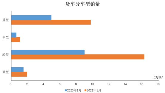 2024年1月,貨車產(chǎn)銷分別完成29.2萬(wàn)輛和28.9萬(wàn)輛,環(huán)比分別下降6.4%和6.6%,同比分別增長(zhǎng)65.9%和81.8%。在貨車細(xì)分品種中,與上月相比,重型貨車和中型貨車產(chǎn)銷明顯增長(zhǎng),輕型貨車和微型貨車產(chǎn)銷呈兩位數(shù)下降;與上年同期相比,四大類貨車品種產(chǎn)銷均呈不同程度增長(zhǎng)。