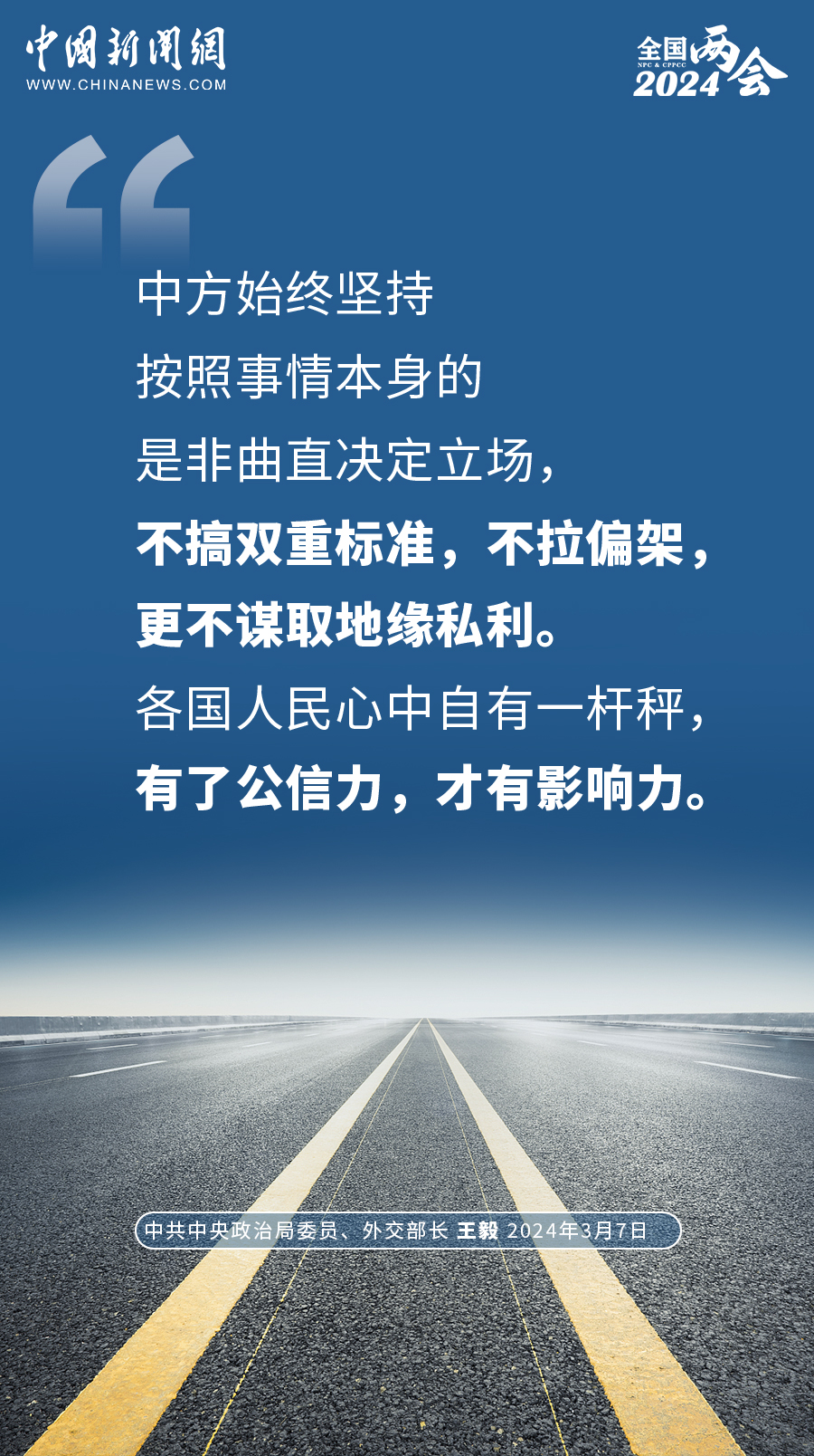 第三是堅持客觀公正。中方始終堅持按照事情本身的是非曲直決定立場,不搞雙重標準,不拉偏架,更不謀取地緣私利。各國人民心中自有一桿秤,有了公信力,才有影響力。