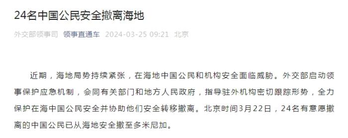 中新網(wǎng)3月25日電 據(jù)外交部領(lǐng)事司微信公眾號“領(lǐng)事直通車”25日消息,近期,海地局勢持續(xù)緊張,在海地中國公民和機構(gòu)安全面臨威脅。外交部啟動領(lǐng)事保護應(yīng)急機制,會同有關(guān)部門和地方人民政府,指導(dǎo)駐外機構(gòu)密切跟蹤形勢,全力保護在海中國公民安全并協(xié)助他們安全轉(zhuǎn)移撤離。北京時間3月22日,24名有意愿撤離的中國公民已從海地安全撤至多米尼加。