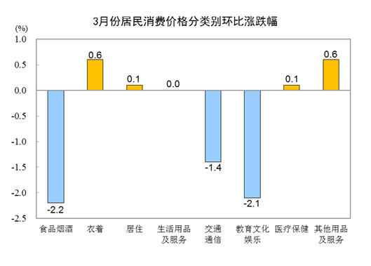 3月份,全國居民消費價格環(huán)比下降1.0%。其中,城市下降1.0%,農村下降0.7%;食品價格下降3.2%,非食品價格下降0.5%;消費品價格下降0.9%,服務價格下降1.1%。