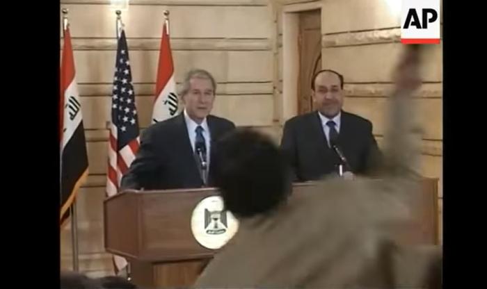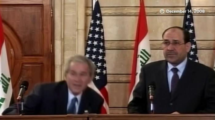 2008年12月,時任美國總統(tǒng)小布什在伊拉克首都巴格達(dá)的新聞發(fā)布會上,被伊拉克記者蒙塔達(dá)爾·扎伊迪扔鞋。圖片來源:美聯(lián)社視頻截圖