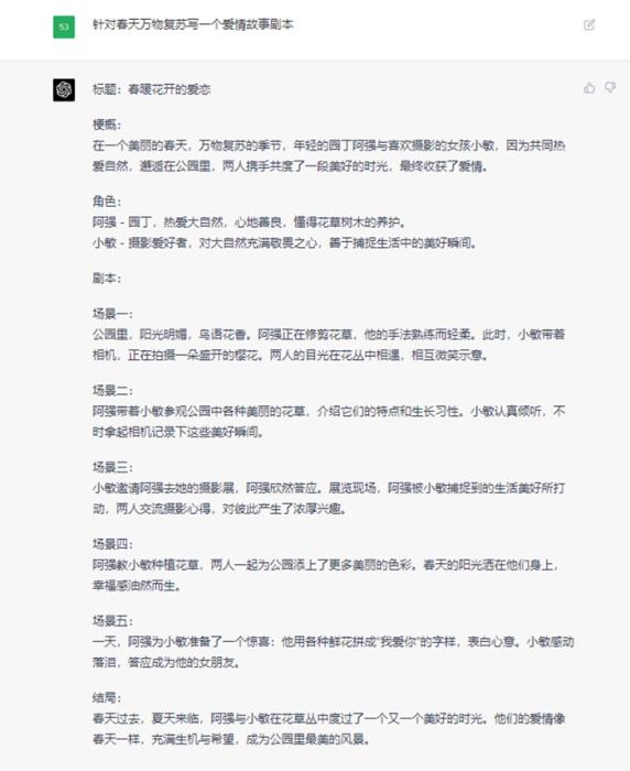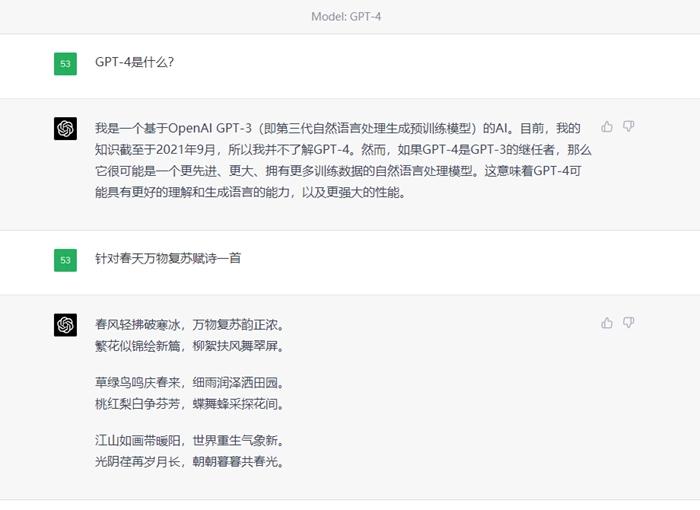 目前GPT-4僅限于ChatGPT Plus訂戶使用。記者體驗(yàn)時(shí)發(fā)現(xiàn),GPT-4生成速度比較慢,但回答簡(jiǎn)明扼要,更有創(chuàng)造性,無論是寫詩歌還是故事劇本都不在話下。例如它可以根據(jù)“春天萬物復(fù)蘇”賦詩一首或者寫成一個(gè)愛情故事的劇本。
