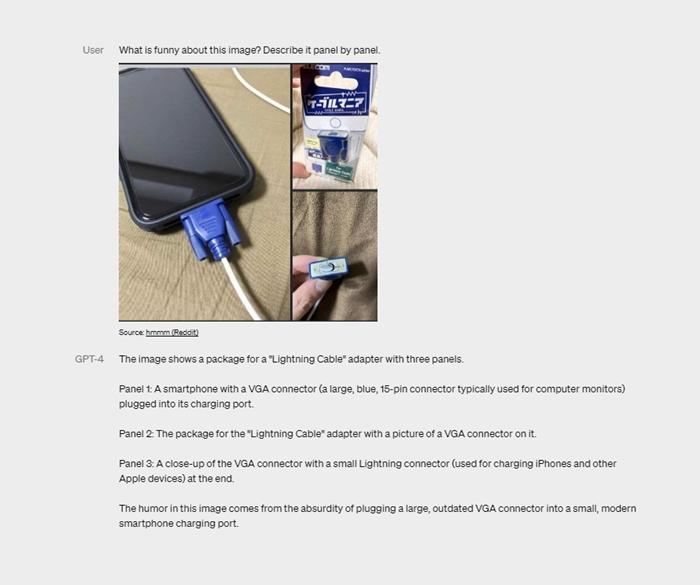 不過據(jù)OpenAI介紹,在輸入一張畫有VGA線連接手機(jī)充電接口內(nèi)容的圖像后,GPT-4除了能描述出這幅圖中的內(nèi)容,還能指出這張圖有哪些不對(duì)勁,“這幅圖中的幽默來自于將一個(gè)大的過時(shí)的VGA連接器插入一個(gè)小的現(xiàn)代化的智能手機(jī)充電端口?!?/p>