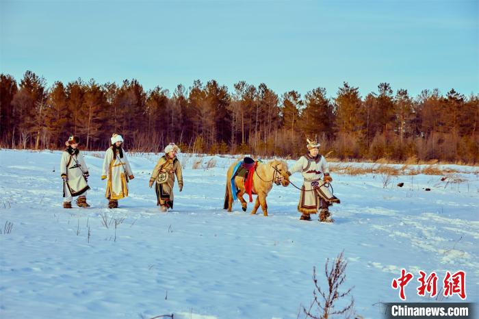 “傻嘟嘟”團(tuán)隊(duì)身穿鄂倫春民族服飾在雪地拍攝 黑龍江省塔河縣文旅局供圖