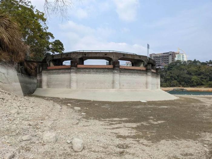 日月潭水位驟降7.4米,溢流井建筑體露出。圖片來源:臺灣中時(shí)新聞網(wǎng)