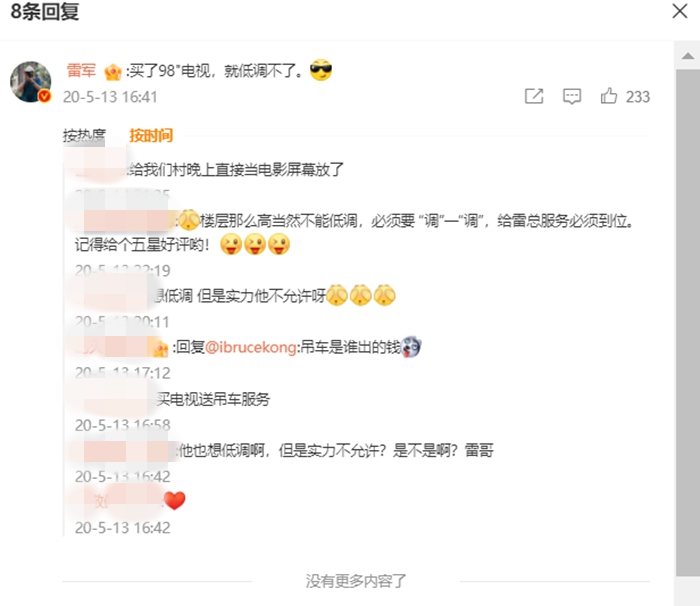 2020年,購買98英寸Redmi MAX 98的王先生安裝電視時動用了吊車,在網(wǎng)絡上引發(fā)關(guān)注。當時小米之家用了相關(guān)圖片刊發(fā)了微博,雷軍還評論“買了98"電視,就低調(diào)不了”。
