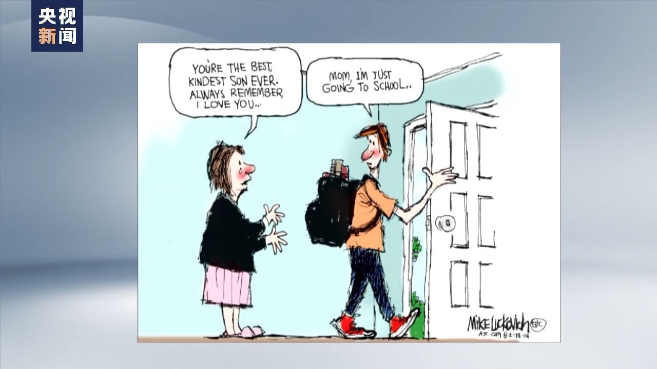 槍支暴力已經(jīng)成為美國(guó)孩子的“頭號(hào)殺手”。在這幅漫畫中,母親流著眼淚,對(duì)準(zhǔn)備出門上學(xué)的孩子叮囑道,“你是最好、最善良的兒子,永遠(yuǎn)要記得這一點(diǎn),我愛(ài)你?!?孩子則有點(diǎn)疑惑地說(shuō),“媽媽,我只是去學(xué)校?!?這就是校園槍擊案頻發(fā)令無(wú)數(shù)父母終日膽戰(zhàn)心驚的真實(shí)寫照。