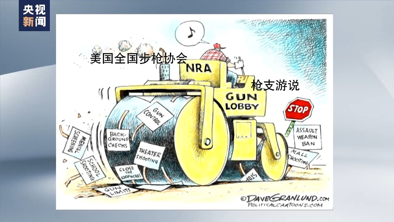 在這幅漫畫中,一名男子聽(tīng)著音樂(lè),漫不經(jīng)心地開(kāi)著一輛寫有“美國(guó)全國(guó)步槍協(xié)會(huì)”、“槍支游說(shuō)”字樣的壓路機(jī)一路向前,撞倒了前方赫然在目的“停止”標(biāo)志。在他身后,“攻擊性武器禁令”、“控槍”、“背景調(diào)查”等標(biāo)志被一一碾壓,接二連三發(fā)生的“校園槍擊”、“劇院槍擊”、“商場(chǎng)槍擊”等慘痛事件也完全被無(wú)視。