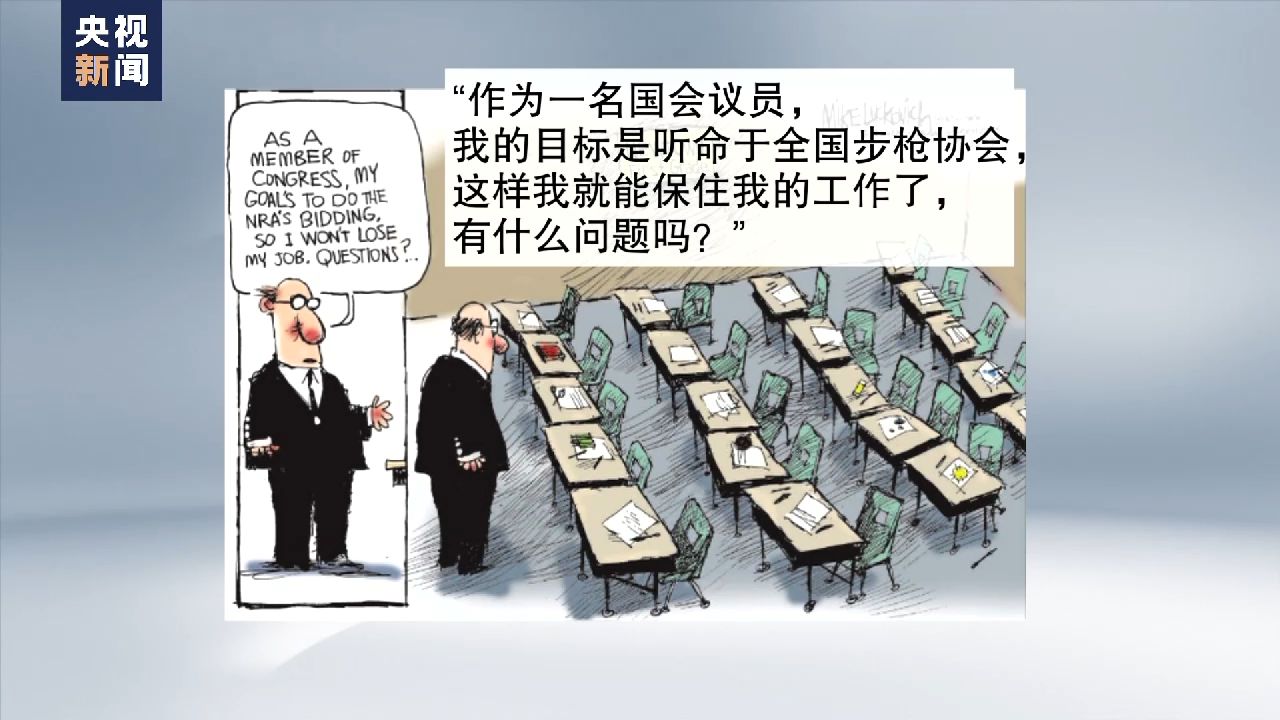 今年,美國(guó)已經(jīng)發(fā)生130起造成至少4人死傷的大規(guī)模槍擊事件。政客與利益集團(tuán)的深度捆綁,令美國(guó)深陷槍支暴力的“惡性循環(huán)”。不少漫畫對(duì)此都有生動(dòng)的刻畫。