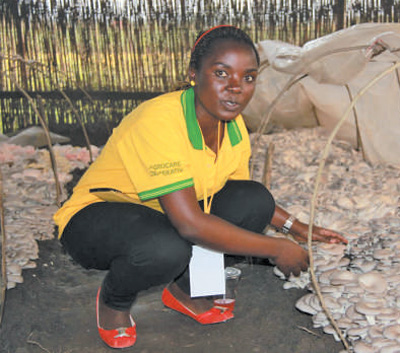 盧旺達(dá)國(guó)立大學(xué)的學(xué)生姍臺(tái)在菇棚中采收平菇。