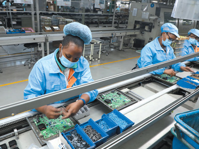 當(dāng)?shù)貑T工在海信南非工業(yè)園的零配件生產(chǎn)車間裝配電機(jī)。