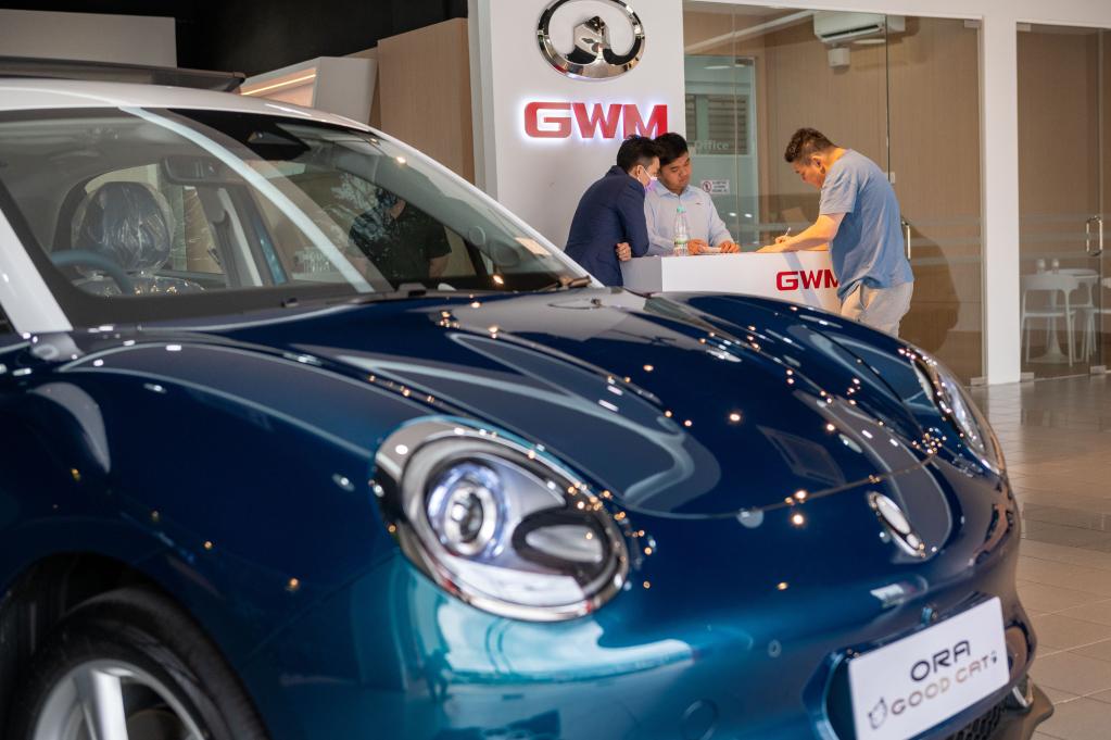 2月17日,在馬來(lái)西亞吉隆坡,一名顧客準(zhǔn)備試駕中國(guó)長(zhǎng)城汽車旗下的歐拉好貓新能源汽車。