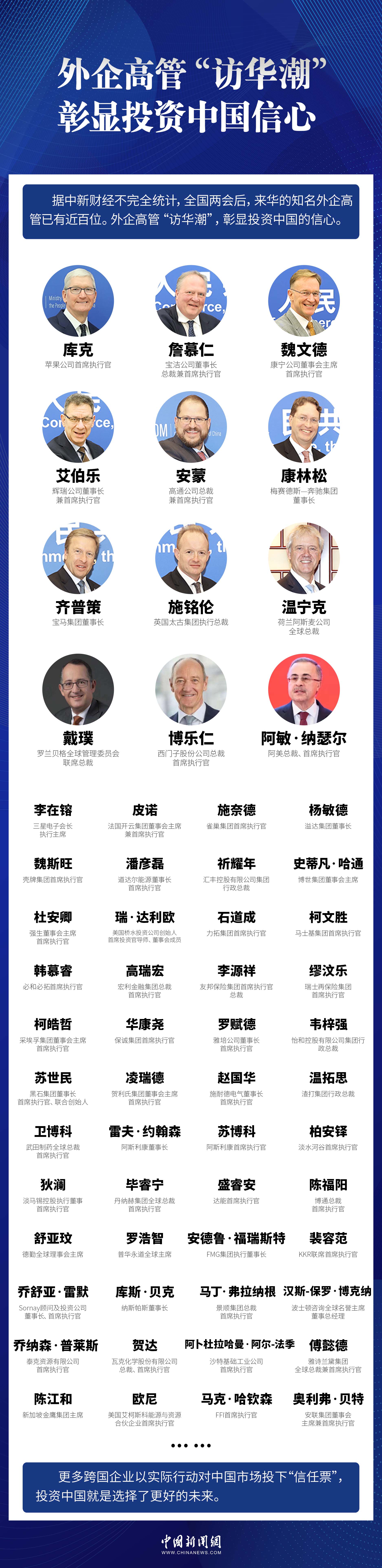 中新網(wǎng)北京4月7日電 (記者 李金磊)時(shí)下,外企高管正掀起“訪華潮”。據(jù)中新財(cái)經(jīng)不完全統(tǒng)計(jì),全國(guó)兩會(huì)后,來華的知名外企高管已有近百位。