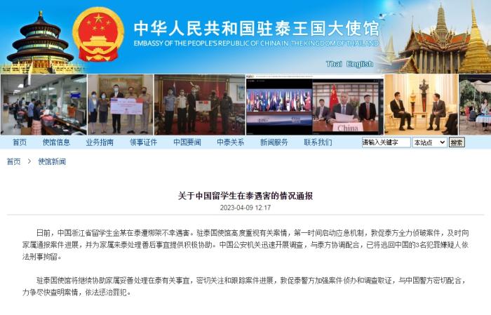 日前,中國(guó)浙江省留學(xué)生金某在泰遭綁架不幸遇害。駐泰國(guó)使館高度重視有關(guān)案情,第一時(shí)間啟動(dòng)應(yīng)急機(jī)制,敦促泰方全力偵破案件,及時(shí)向家屬通報(bào)案件進(jìn)展,并為家屬來(lái)泰處理善后事宜提供積極協(xié)助。中國(guó)公安機(jī)關(guān)迅速開(kāi)展調(diào)查,與泰方協(xié)調(diào)配合,已將逃回中國(guó)的3名犯罪嫌疑人依法刑事拘留。