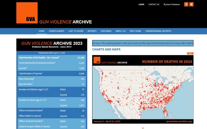 2023年1月1日至4月16日,美國(guó)槍支暴力事件分布圖。圖片來(lái)源:美國(guó)“槍支暴力檔案”網(wǎng)站截圖