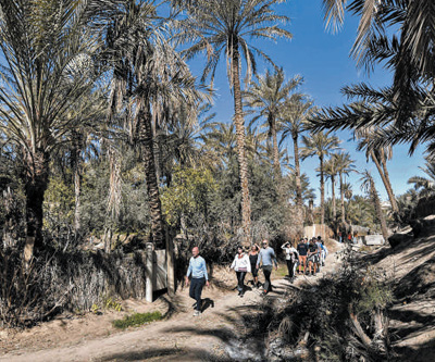突尼斯西南部鹽湖附近的一處沙漠綠洲中,游客在棕櫚樹(shù)林中散步。